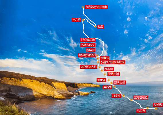 加州一号公路,由北至南连接着旧金山与洛杉矶,沿途连接了数个明珠一般散落在太平洋沿岸的小镇,串起了蒙特利 ,十七英里,卡梅尔,大苏尔,赫氏古堡,圣塔芭芭拉等著名小镇和名胜,沿着美国西海岸蜿蜒前进,全长超过 1000公里。